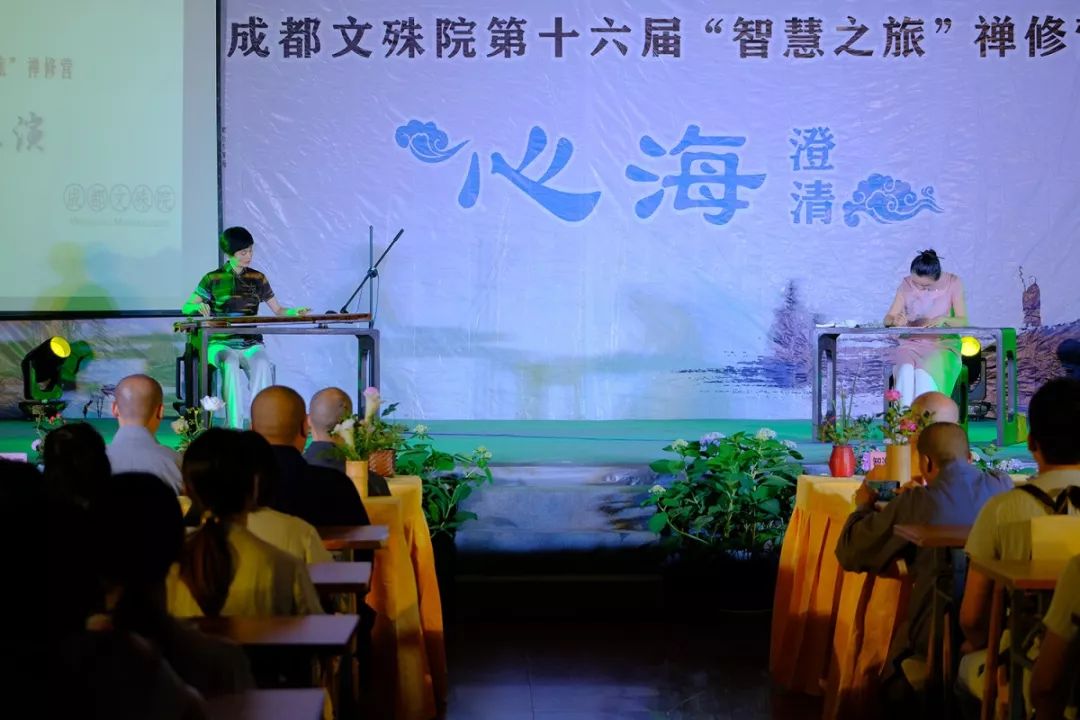 接下来,是一组文殊院文化艺术中心精心编排的开营节目。艺术中心合唱团合唱的《心经》,让营员在动人的旋律中感受佛法的庄严,修心的喜悦。双人舞《七秀坊》则通过民族舞蹈的形式为炎炎夏日带来爽朗。琴韵悠悠,心海叮咚,古琴与书画节目《心海澄清》让营员将心安住,体验传统文化的魅力。“文殊朝钟”是成都十景之一,形容的是文殊院的文化景观。舞蹈《文殊朝钟》,让营员欣赏到来自净土的安宁与美好。合唱《观音礼赞》,则通过歌声让大家心归宁静,心生欢喜。